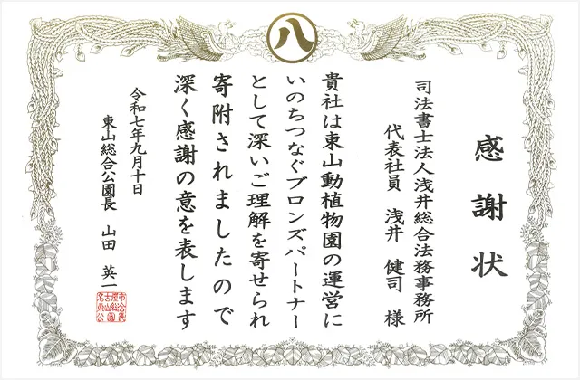 司法書士法人浅井総合法務事務所は、名古屋市東山動植物園が推進する「いのちつなぐパートナー」(ブロンズパートナー)として、同園を継続的に支援しています。